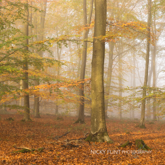 The beautiful colours of autumn in a beech wood, softened by a gentle mist.