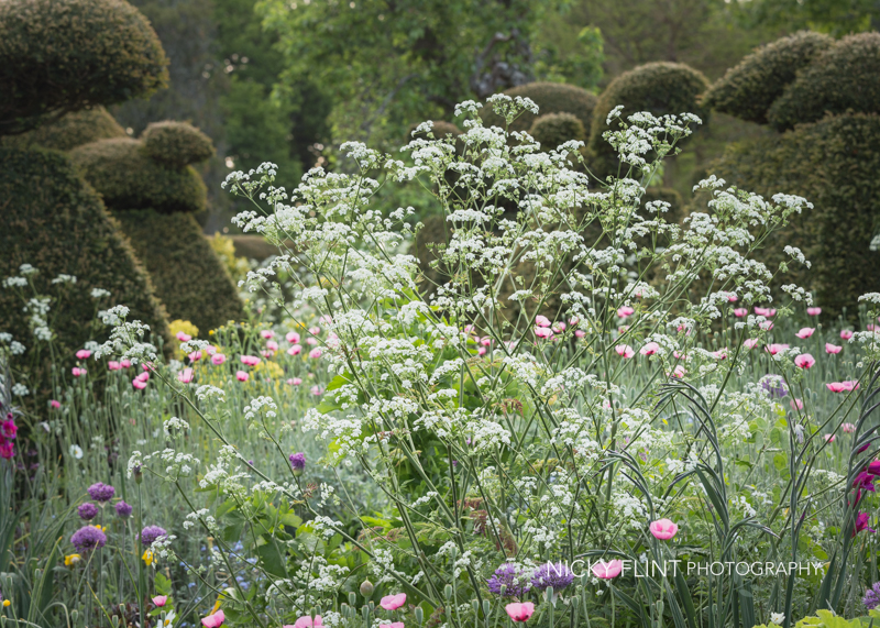 Ephemeral, light and delicate: cow parsley in the Great Dixter Peacock Garden contrasts with the dark, solid presence of the yew topiary.