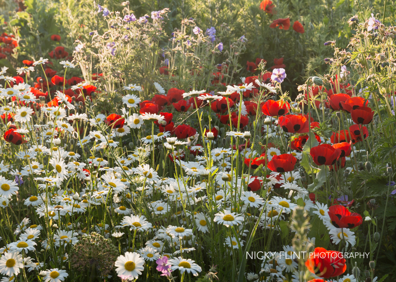 Ladybird poppies thread through and around ox-eye daisies and geraniums in the High Garden at Great Dixter.