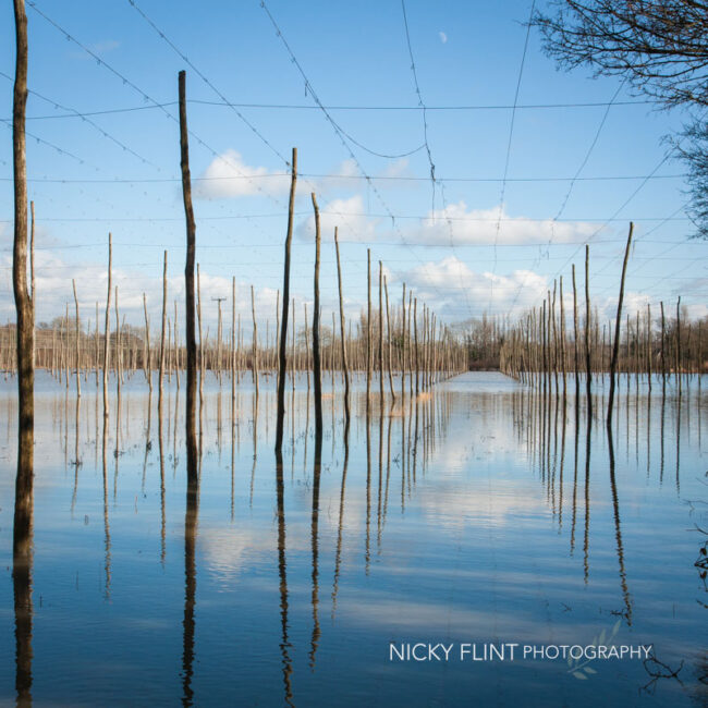 Beautiful lines and reflections in a flooded hop garden.