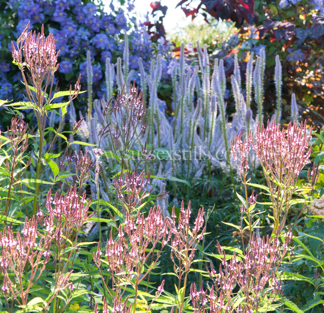 A glorious picture of a mixed border in all its pomp and glory, with Verbena hastata, Veronicastrum virginicum ‘Lavendelturm’ and Clematis ‘Perle d’Azur’ stealing the show.