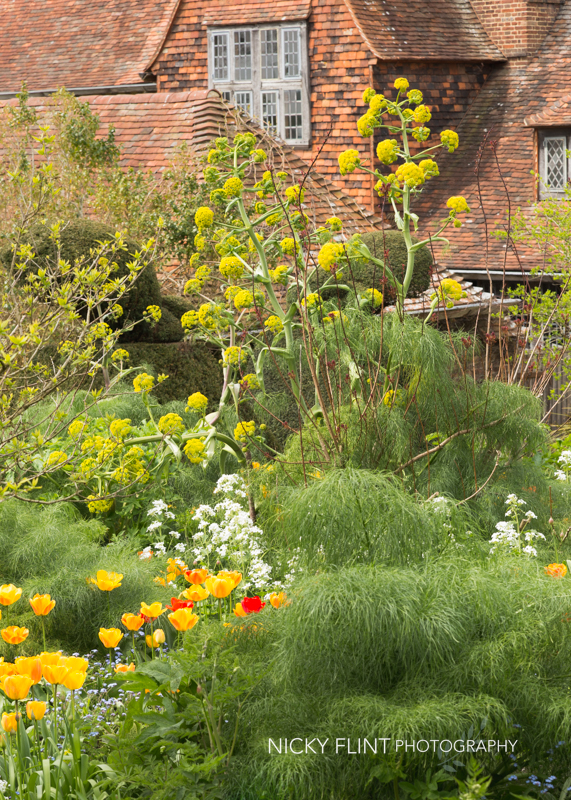 Ferula communis and tulips flowering against the brick and tile backdrop of Great Dixter.